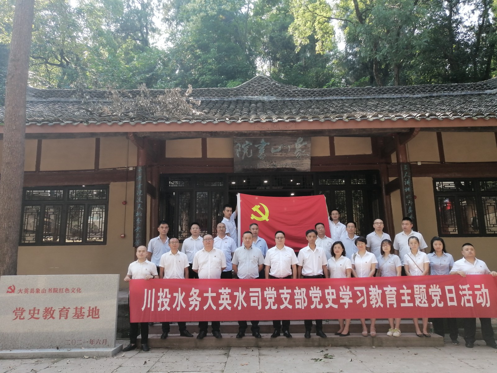 为更好地继承和发扬党的优良传统,大力营造爱党爱国爱社会主义的浓厚氛围,持续树牢“永远跟党走”的坚定理想信念,大力唱响共产党好、社会主义好、改革开放好、伟大祖国好、各族人民好的时代主旋律。认真落实习近平总书记“要让红色基因注入血脉,代代相传”指示精神,巩固深化“不忘初心、牢记使命”主题教育成果,着力引导广大干部群众把党的历史学习好、总结好、传承好、发扬好。根据川投水务大英水司党支部党史学习教育计划,7月23日上午,川投水务大英水司党支部组织全体党员,预备党员、入党积极分子,前往大英县象山镇象山书院红色文化党史教育基地,开展“不忘初心再出发·奋进伟大新征程”党史学习教育主题党日活动。此次活动,受川投水务大英水司执行董事、总经理王文川委托,由党支部组织委员、副总经理、工会主席王洪先主持。