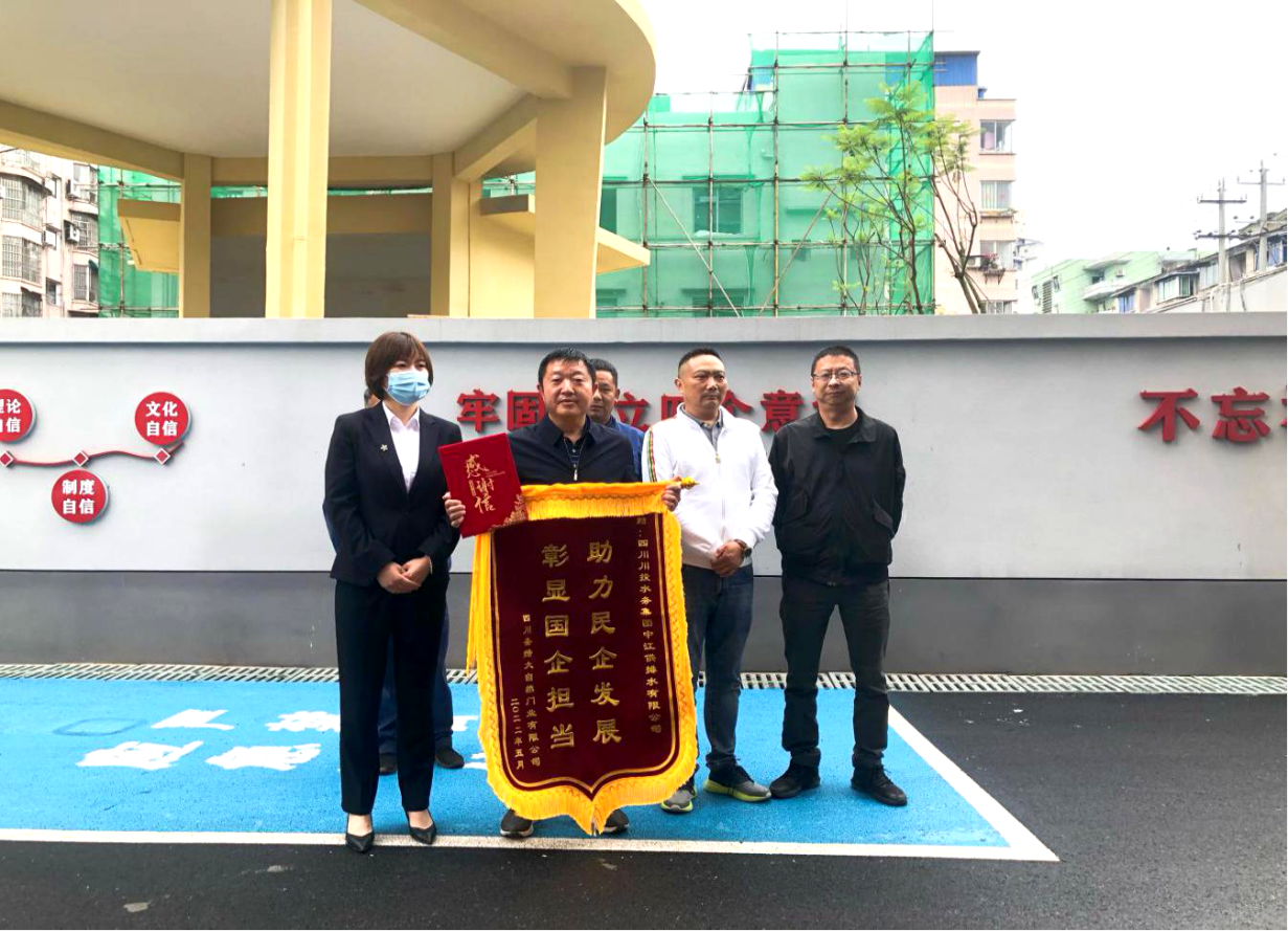 5月18日下午,四川圣缔大自然门业有限公司来到中江水司,将一封感谢信和一面印有“助力民企发展 彰显国企担当”的锦旗送到党支部书记、董事长、总经理朱禹手中,以表达对中江水司解决其用水困难的高度赞扬和诚挚谢意。