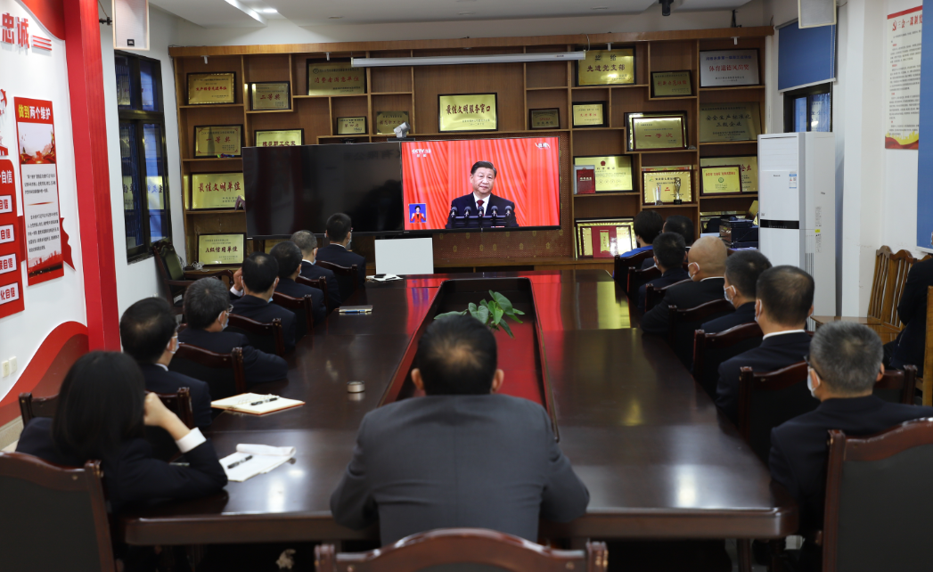 上午9时40分,荣县水司中层以上管理干部及部分党员代表共21人在公司会议室完成签到并入座,共同期待着收看开幕会。随着嘹亮的国歌声响起,大家全体起立,共同跟唱,爱党爱国之情在心中澎湃激荡。在观看大会的过程中,大家认真学习着振奋人心的报告内容,听着习总书记坚定有力的话语频频鼓掌,胸中满是欣喜和期盼。