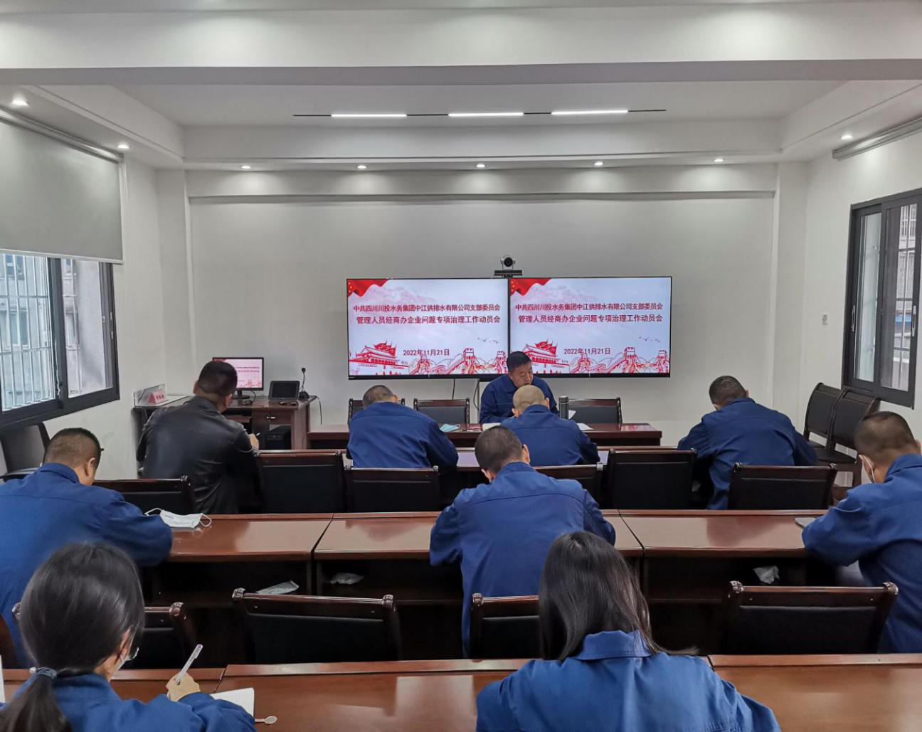 2022年11月21日下午,中江水司组织召开管理人员经商办企业专项治理工作动员会,会议由党支部书记、董事长、总经理朱禹主持,公司中层以上管理人员参加会议。