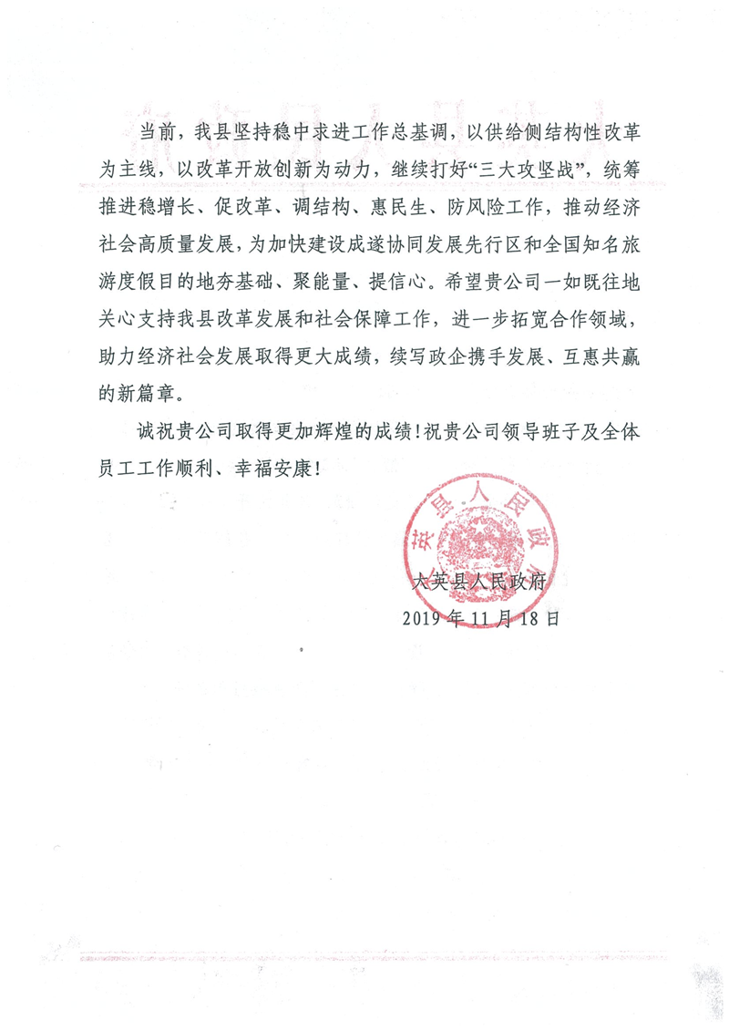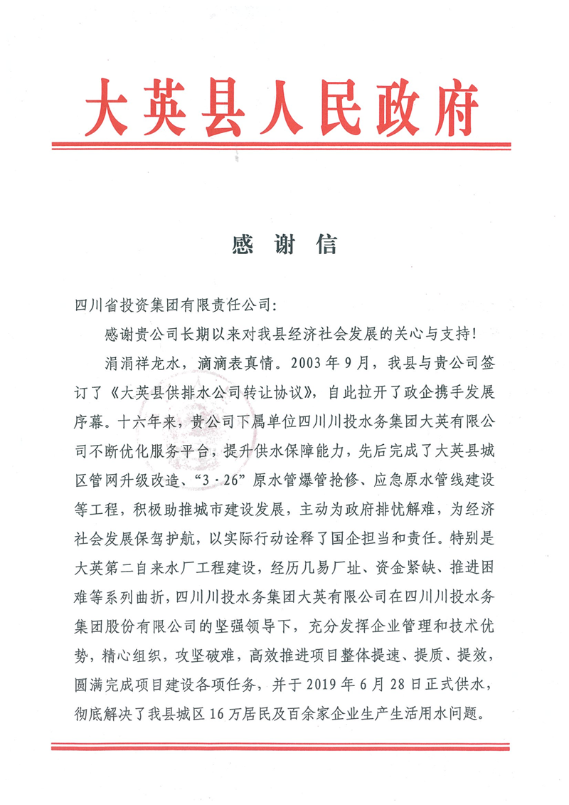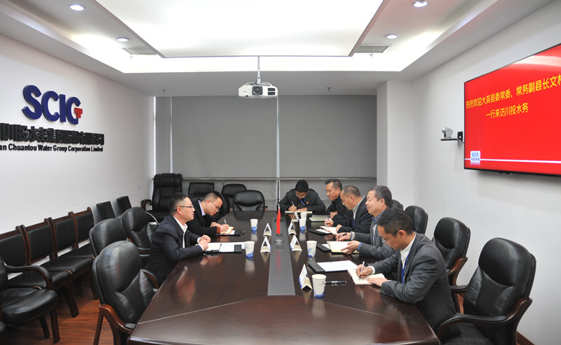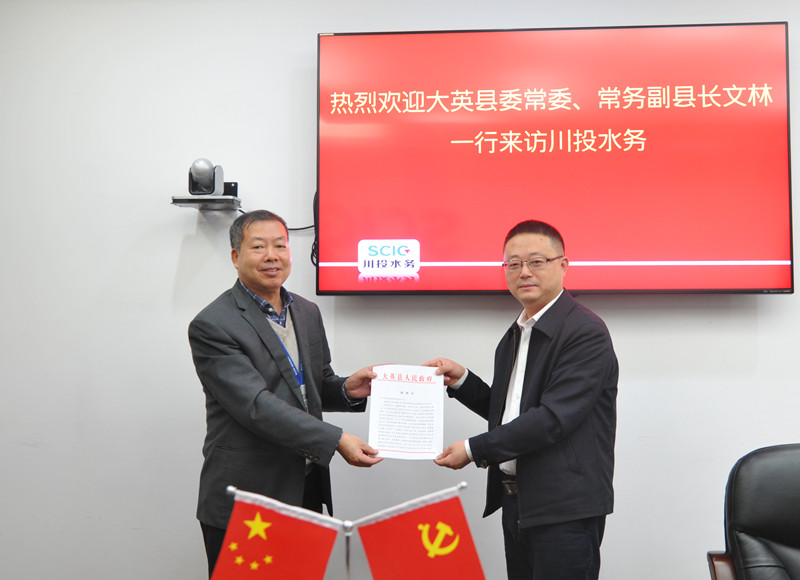 2019年11月19日,大英县委常委、县人民政府常务副县长文林来访川投水务,并代表大英县人民政府向川投集团、川投水务送来感谢信。川投水务党委书记、董事长梁有国,党委副书记、总经理邓锐在川投大厦24楼会议室会见文副县长一行。
