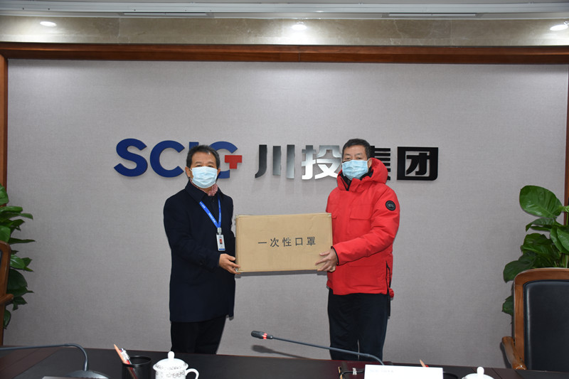 会后,李总代表川投集团将2000只一次性口罩交到梁董事长手中。