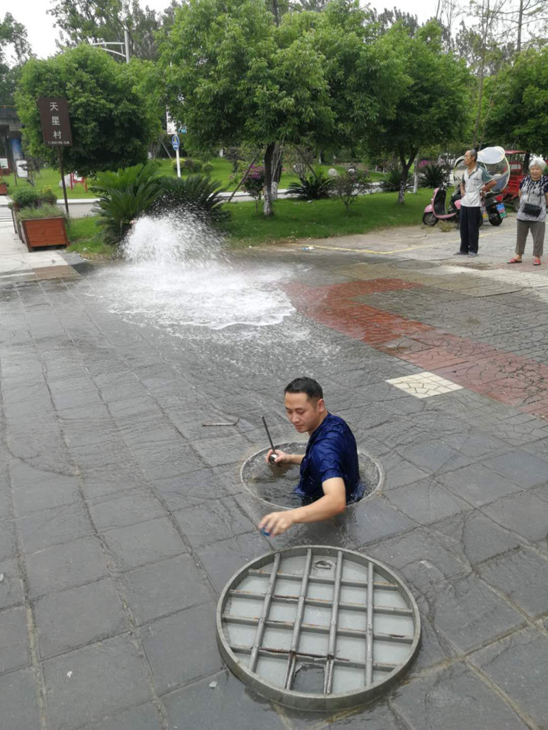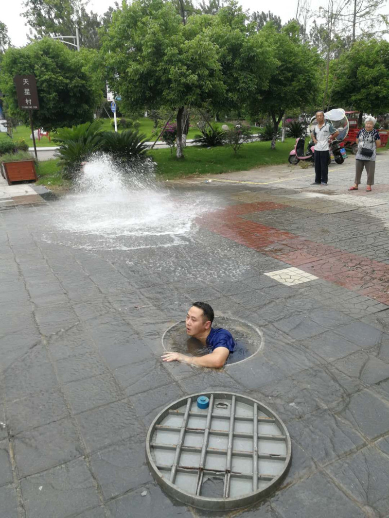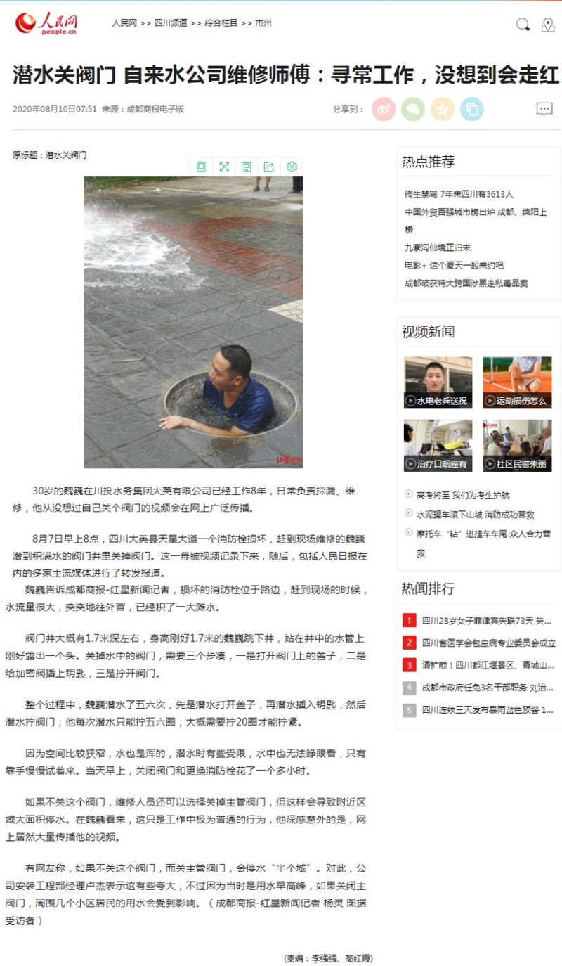 近日来,一则短视频在网上广泛流传并引发热议。视频中的城市路面因消防栓损坏导致路面大量积水,一名身着蓝色工作服的男子在没有借助任何辅助设备的情况下反复通过闭气方式潜入阀门井,并最终成功关闭水下的阀门,完成排险。包括人民网、中国共青团网、工人日报、经济日报、法治日报、成都商报、抖音、梨视频在内的多家主流媒体均对此事件进行了转发报道,目前该视频浏览、点击量已达百万,视频中的男子赢得了网友们的一致好评,也成了名副其实的“网红”,网友们亲切的称呼其为“开关侠”。他便是川投水务大英水司维修抢险队队员魏巍。