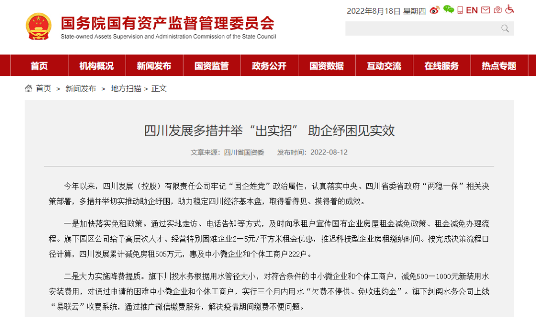 近日,国务院国资委官网刊发《四川发展多措并举“出实招”助企纾困见实效》一文,其中介绍了四川发展旗下川投水务大力实施降费提质工作成效。