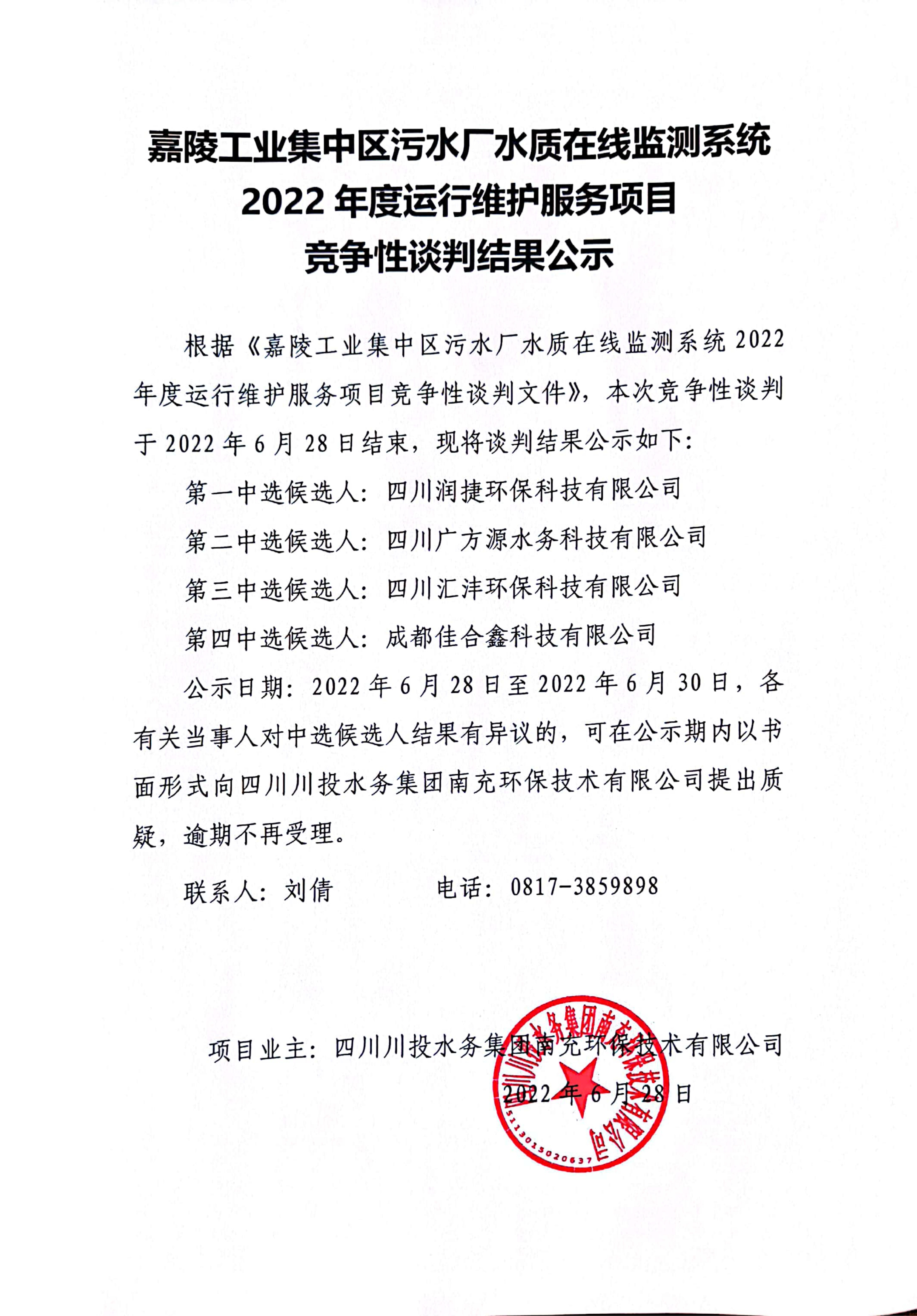 南充嘉陵工业集中区污水厂水质在线监测系统2022年度运行维护服务项目竞争性谈判结果公示