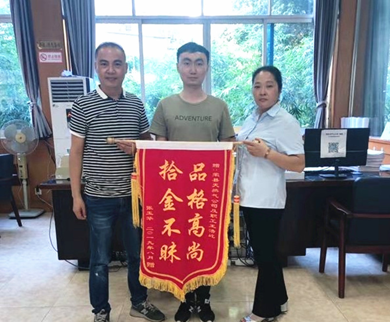 9月10日上午上班伊始,荣县天然气公司就收到张女士送来的一面锦旗,她对拾金不昧的营销部员工王浩屹表示感谢和赞扬。