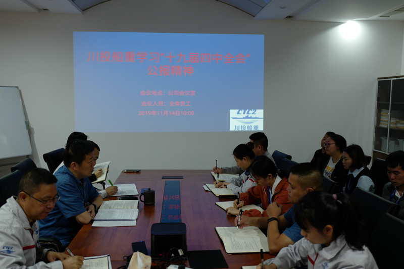 为深入贯彻党的十九届四中全会精神和落实国资委对国企的要求和部署,川投船重积极响应,迅速在2019年11月14日上午召开公司大会,组织全体员工学习习近平总书记在党的十九届四中全会中的重要讲话及《中共中央关于坚持和完善中国特色社会主义制度推进国家治理体系和治理能力现代化若干重大问题的决定》全会等会议精神。