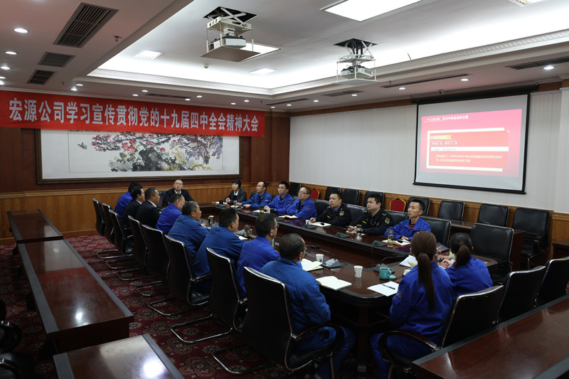2019年11月22日下午3点,宏源公司在11楼中会议室召开学习宣传贯彻党的十九届四中全会精神大会。公司党委委员、班子成员、支部书记、群团组织主要负责同志、党委办工作人员参加会议。公司党委书记、总经理李旭东主持会议。
