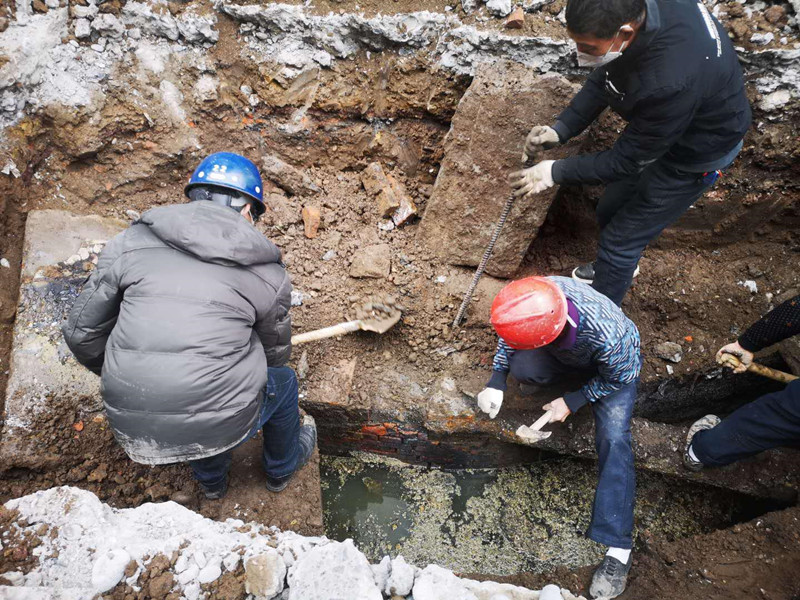 2020年2月18日晨,公司接连接到中江县城西路用户反映家中停水,同时继光水厂值班室也发现城西片区压力比平时略有降低。公司党支部书记、总经理朱禹接到汇报后立即询问应急值班维修人员有无应急维修停水抢修点位,当得到肯定的答复后,立即组织相关人员进行分析研判,基本确定城西片区管网发生爆管。随即安排工程抢险队人员做好个人防护,第一时间兵分两路对这片区近一公里的管网进行分段排查。不到一小时,排查人员即发现城西路金林物资公司外街道下面DN150水泥管爆裂致使该片区用户停水。