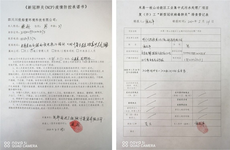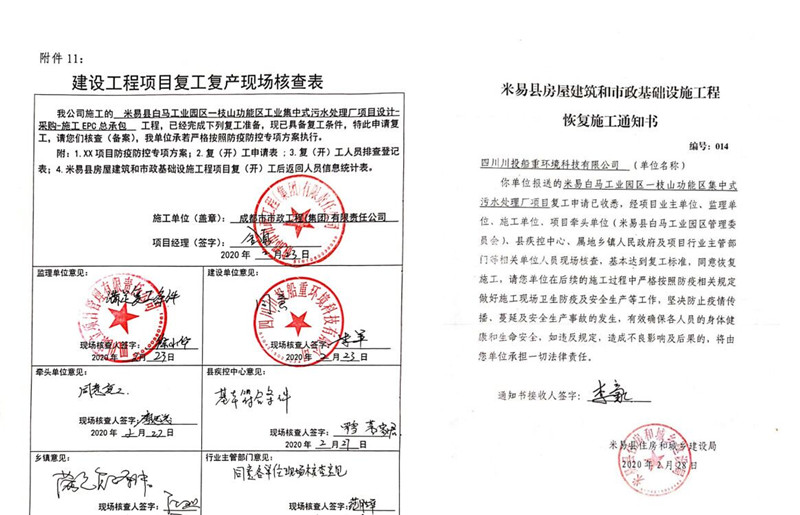 四川川投船重环境科技有限公司为坚决打赢新冠肺炎NCP疫情防控阻击战,早日实现项目复工,按照属地管理要求,毫不松懈地抓好春节期间及节后公司、施工单位人员疫情防控工作,提前谋划和部署公司及项目现场在NCP疫情期间的防控管理工作及施工组织方案、措施和应急预案。做好防疫情,抓复工,盯安全,重施工,合理有序组织复工及防疫工作。经米易县政府组织有关部门对施工现场防疫措施及防疫物资准备等工作的现场核查,达到复工标准。在2020年2月28日取得米易县首批建筑施工项目复(开)工批准令后复工(米易住建局编号014号《恢复施工通知书》),目前正按县政府关于复工相关要求,全力组织施工单位人员持健康证明等手续陆续进场。