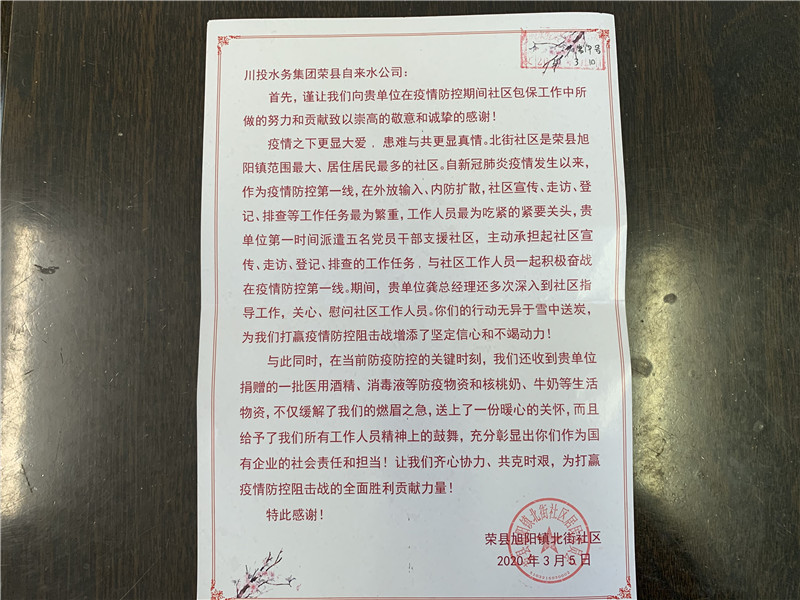 急群众之所急,想群众之所想。这一面锦旗和一封感谢信不仅代表着北街社区对公司所做工作的充分肯定和认可,更彰显了作为供水企业的社会责任和担当,树立了良好的社会形象。疫情当前,荣县水司定当会继续落实疫情防控工作和生产经营工作举措,同心协力、共克时艰,全力做好疫情防控和安全稳定供水工作!