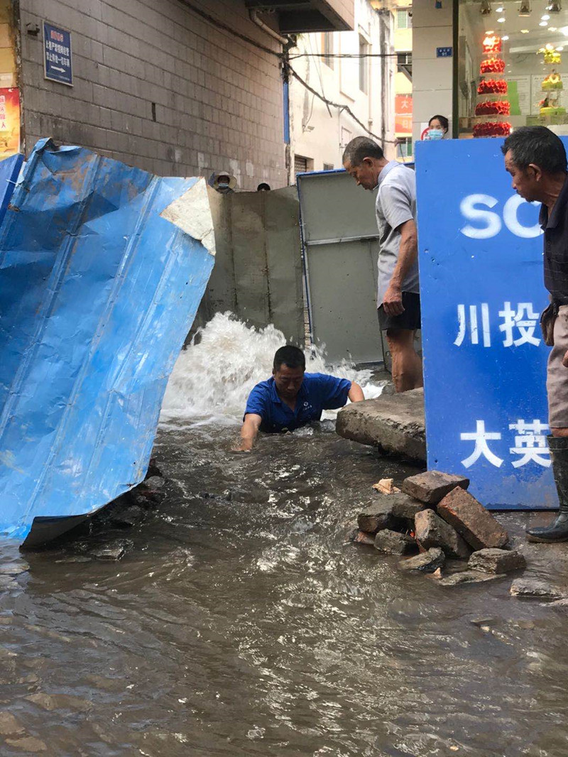 接到报漏后,大英公司第一时间组织抢修队到达现场,仔细查看,为了保证安全,决定立即进行打围处理。同时,抢修员不顾水压冲击和水下不明安全隐患,毅然下到水坑,屏住呼吸,沉入水下,探找水阀开关,近30分钟后,爆管位置水下闸阀关停,路面积水开始回落。