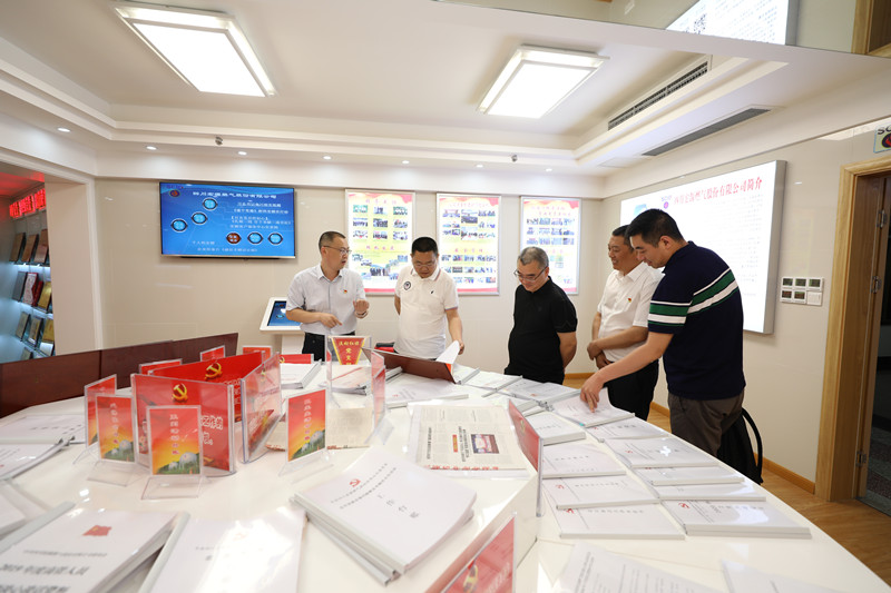 上午11:20分,赵矿长一行参观了4楼走廊文化建设、电梯文化建设、“家事国事天下事”“历史上的今天”等党建文化阵地,来到4楼党群文化中心,公司党委书记、总经理李旭东向赵矿长一行详细介绍了公司党建工作基本情况和8个组织各自的特色亮点工作,介绍了公司各支部、各部门近期开展的“统筹疫情防控、生产经营和党的建设恳谈活动”等情况。公司党委近年来深入学习宣传贯彻习近平新时代中国特色社会主义思想融入日常、抓在经常,并通过学习《习近平新时代中国特色社会主义思想学习纲要》《习近平关于“不忘初心、牢记使命”重要论述选编》等书籍、党员人人背诵“党的基础知识14项”、30岁以下青年员工每天坚持书法练习等方式,增强“四个意识”,坚定“四个自信”,做到“两个维护”,更好地促进了企业发展。