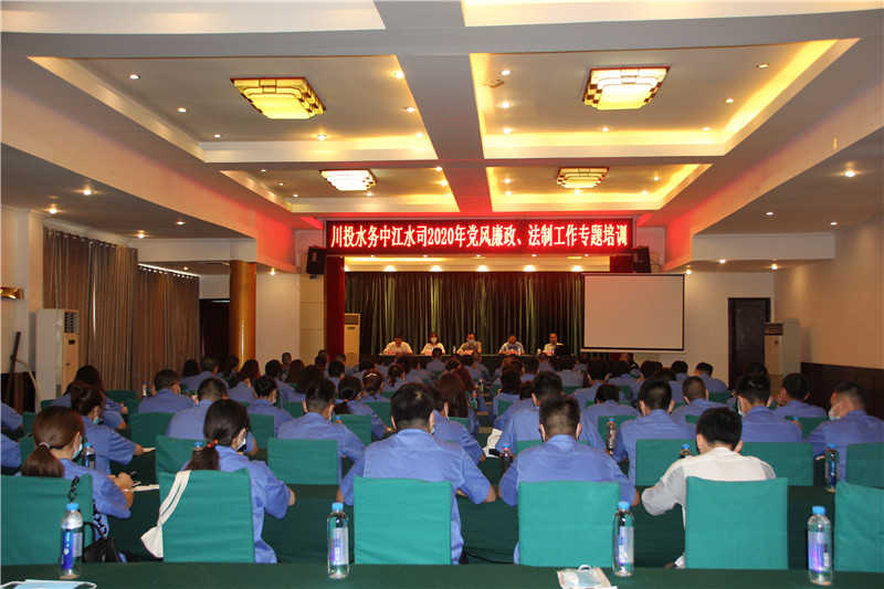 为进一步加强中江水司党风廉政建设和法制工作,按照川投集团和川投水务集团工作部署,2020年7月15日下午,中江水司组织召开了2020年党风廉政、法制工作专题培训会。此次培训会邀请了德阳市政法委副书记、德阳市法学会常务副会长程正春、四川仁竞律师事务所主任吴明全为大家专题授课。中江县政法委副书记冉辉、德阳市法学会秘书科科长曹茗菁陪同出席。公司全体员工、法律顾问共计91人参加培训。会议由党支部书记、董事长、总经理朱禹主持。