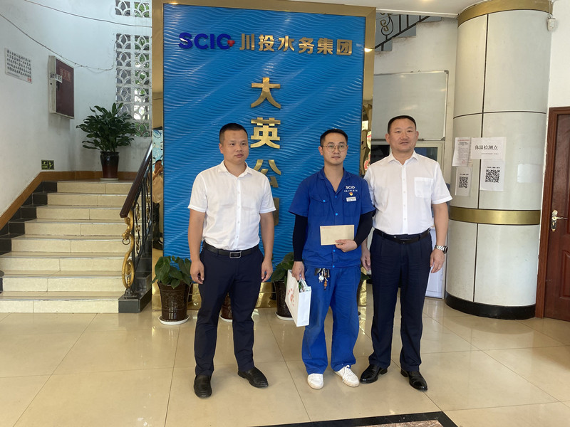 8月10日下午5时30分,大英县委副书记、县长胡铭超,县委常委、县委办公室主任、县总工会主席谭银,遂宁市中国死海旅游度假区管委会副主任敬云川等领导来到川投水务大英水司老城服务大厅,向前几日为最大限度保障供水、降低停水影响、毅然5次潜下灌满消防水的闸阀井关闭闸阀而引发社会广泛关注的川投水务大英水司“开关侠”魏巍表达问候和祝福,并送上慰问金。