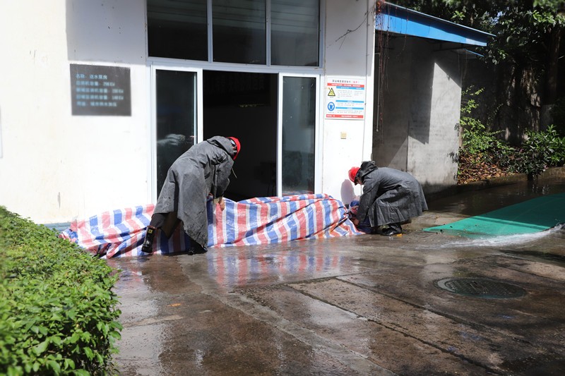 抗震救灾应急演练结束后,公司随即开展了防洪防汛防涝应急演练。模拟在天气突然强降雨的情况下,接到险情报告后,按照演练方案立即启动防洪、防汛、防涝应急预案。值班人员发现险情后,立即向部门负责人报告,参演人员迅速采取措施,用沙袋进行防护,阻挡洪水进入泵房。