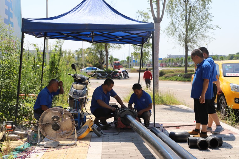 骄阳似火,室外温度高达45摄氏度以上,在没有任何遮挡物的情况下,维修队员顶着烈日、冒着酷暑,他们个个汗如雨下,却依然咬牙坚持,毫不犹豫地与时间赛跑,能早一刻通水,该片区的用户就能减少一份酷热!抢修工作有条不紊的进行着:清理积水、开挖沟槽、切割和热熔塑料管材、焊接断面……在天然的“桑拿房”里,加上工作电机散发岀的灼热,维修队员身上的衣衫早己被汗水浸透了一遍又一遍,沟槽里空间狭小,湿热难耐,但他们对抢修工作却没有丝豪怨言和懈怠。与此同时,公司紧急联系市政管网用水车送水(共计20余吨)至健宏加气站、中石化加油站和周边居民家中,有效缓解了群众短期内生活用水问题。