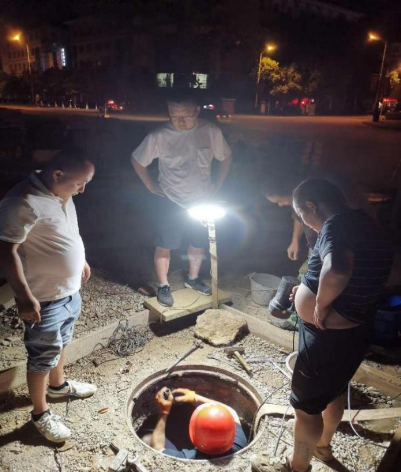 经过现场勘察后,工程部部长肖剑率先下井迅速关阀止水,抢修人员随即投入到紧张的抢修作业中。在有限的作业空间内,排空积水、管材准备、管道修复等各道工序有条不紊地进行着,抢修人员抢时间、抢速度,挑灯夜战,争分夺秒进行抢修。夏日的夜里热气腾腾,让人难以忍受,工作坑里抢修人员克服恶劣天气,干劲十足,终于在21日凌晨4点完成了管道的抢修工作。紧接着,抢修人员于开始进行管道排气、排水工作,待完成开阀并恢复供水后,已是清晨5点半了。