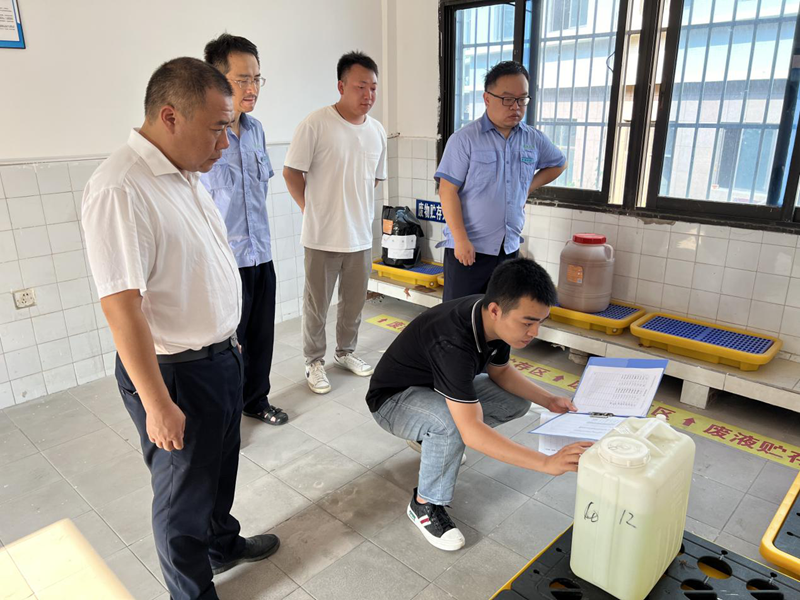 首先,刘总一行前往生产一线实地查看生产厂区、环检公司等区域,重点检查危废暂存间是否落实“一物一码”要求,化验药品出入库台账等情况,同时查阅了危废和污泥处置合同、转运联单等相关资料。