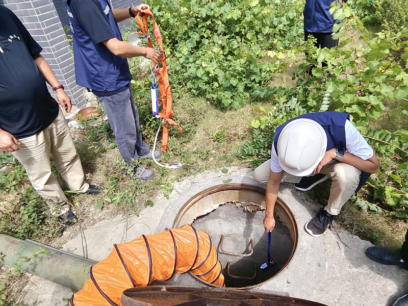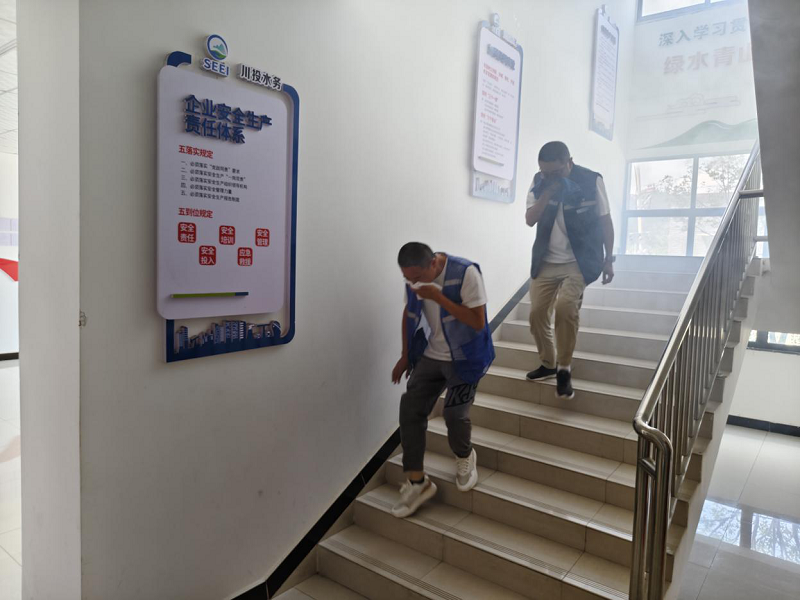 演练以实战为导向,分三阶段展开:首先模拟有限空间作业突发事故,一名运行人员因阀门卡阻失衡,撞击井壁昏迷。监护人员施救时发现单人难以完成,随后在团队协作下,通过规范流程完成伤员转移救治;第二阶段,演练指导人员点燃干柴模拟火情,员工依次实操灭火器灭火;最后模拟办公楼起火,组织全员安全疏散逃生。整个过程中,参与人员反应迅速、分工明确,各环节衔接有序,达到预期效果。