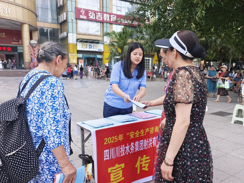 2025年6月是第24个全国“安全生产月”,主题是“人人讲安全、个个会应急——查找身边安全隐患”。6月16日为全国“安全宣传咨询日”,当日上午,川投水务射洪公司组织员工前往射洪市新世纪广场,开展“6·16安全宣传咨询日”主题活动。